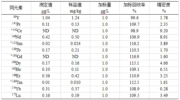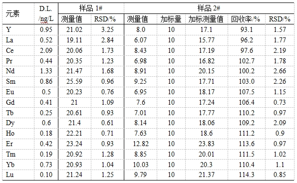 參考《GB/T 18115.1-2020 稀土金屬及其氧化物中稀土雜質化學分析方法 第1部分:鑭中鈰、鐠、釹、釤、銪、釓、鋱、鏑、鈥、餌、銩、鐿、镥和釔量的測定》,將高純氧化鑭用稀硝酸溶解,利用內標法進行校正。考察加標回收率及精密度。方法加標回收率為98.9%~116.9%,精密度為0.28%~9.20%。