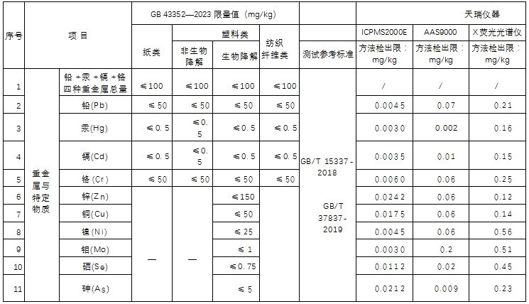 針對剛正式實施的快遞包裝首個國標,參考GB43352標準,采用ICP-MS2000E測定快遞塑料包裝袋中鉛汞鎘鉻等十項金屬元素,各元素檢出限在0.012~0.097μg/L,加標回收率在94.4%~102.2%之間,精密度在1.15%~6.60%之間;各元素測量值均在國標要求的限值范圍內。本實驗結果表明該方法具有良好的穩定性及精密度,完全滿足快遞塑料包裝袋中重金屬元素的測定。