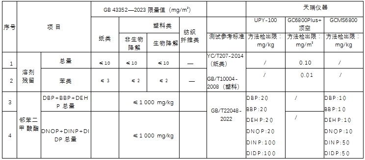 表 5. 溶劑殘留、鄰苯二甲酸酯類物質限量及檢測一覽表