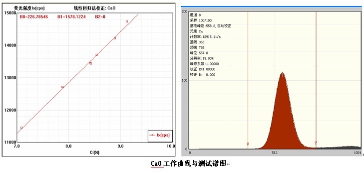 各個(gè)元素的工作曲線與測試譜圖,其中B0為曲線節(jié)距;B1:為曲線斜率;在測試譜圖中有元素的測試信息:計(jì)數(shù)率,采樣時(shí)間,分辨率等。
