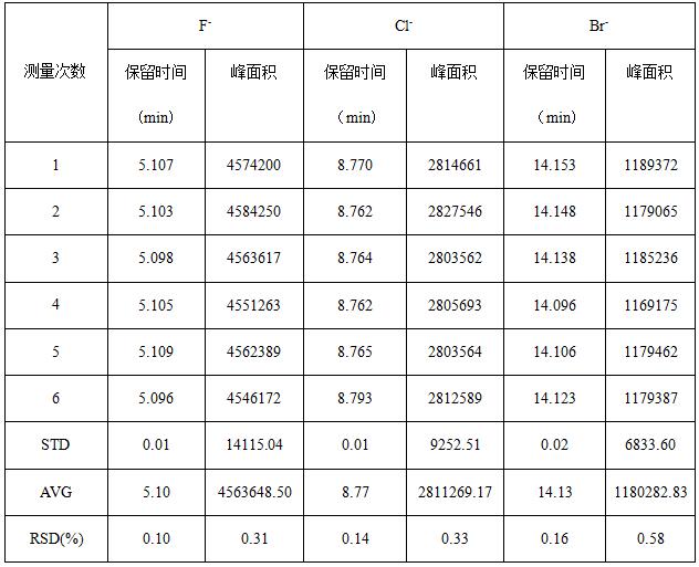 取2.0μg/mL F-、Cl-、Br-混合標準標準溶液重復進樣6次,考察保留時間和峰面積的重復性,詳見圖4;其中保留時間(tR)相對偏差在0.10%-0.16%之間,峰面積(S)的相對標準偏差在0.38%~0.53%之間,重復性結果詳見表1。