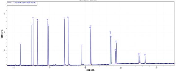 1. 二氯二氟甲烷;2. 氯甲烷;3. 氯乙烯;4. 溴甲烷;5. 氯乙烷;6. 三氯氟甲烷;7. 1,1-二氯乙烯;8. 二氯甲烷;9. 反-1,2-二氯乙烯;10. 1,1-二氯乙烷;11. 2,2-二氯丙烷;12. 順-1,2-二氯乙烯;13. 溴氯甲烷;14. 氯仿;15. 1,1,1-三氯乙烷;16. 四氯化碳;17. 1,1-二氯丙烯;18. 1,2-二氯乙烷;19. 氟苯(內(nèi)標(biāo)物1);20. 三氯乙烯;21. 1,2-二氯丙烷;22. 二溴甲烷;23. 一溴二氯甲烷;24. 順-1,3-二氯丙烯;25. 反-1,3-二氯丙烯;26. 1,1,2-三氯乙烷;27. 四氯乙烯;28. 1,3-二氯丙烷;29. 二溴一氯甲烷;30. 1,2-二溴乙烷;31. 1,1,1,2-四氯乙烷;32. 溴仿;33. 4-溴氟苯(內(nèi)標(biāo)2);34. 1,1,2,2-四氯乙烷;35. 1,2,3-三氯丙烷;36. 1,2-二氯苯-d4(替代物);37. 1,2-二溴-3-氯丙烷;38. 六氯丁二烯