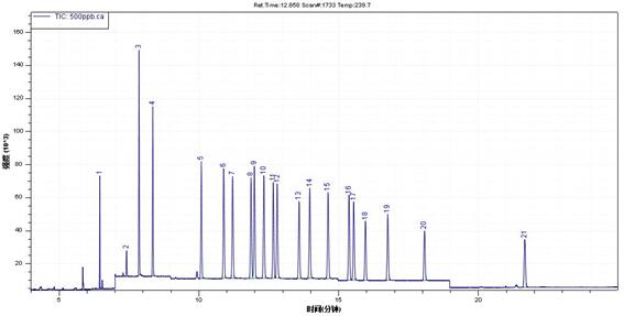 1. 四氯間二甲苯(替代物);2. 蒽-d10(內(nèi)標(biāo)物);3. PCB 28;4. PCB 52;5. PCB 101;6. PCB81;7. PCB 77;8. PCB 123;9. PCB 118;10. PCB 114;11. PCB153;12. PCB105;13. PCB 138;14. PCB126;15. PCB167;16. PCB156;17. PCB157;18. PCB180;19. PCB169;20. PCB189;21. PCB 209(內(nèi)標(biāo))