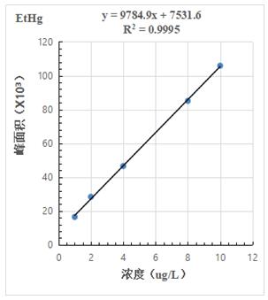 1.0μg/L、2.0.μg/L、4.0μg/L、8.0μg/L、10.0μg/L 汞形態混合標準溶液分離色圖譜如圖3所示,其中無機汞(Hg2+)、甲基汞(MetHg)、乙基汞(EtHg)相對保留時間分別為118s、185s、379s,從譜圖疊加圖上可以看出,三種汞形態出峰時間穩定,且分離度較好。