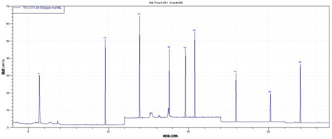 水樣經固相萃取柱濃縮、凈化、洗脫后,氮吹定容到一定體積,過濾后樣品經氣相色譜分離后,用質譜進行檢測。通過與待測目標物標準質譜圖相比較和保留時間進行定性,外標法定量。